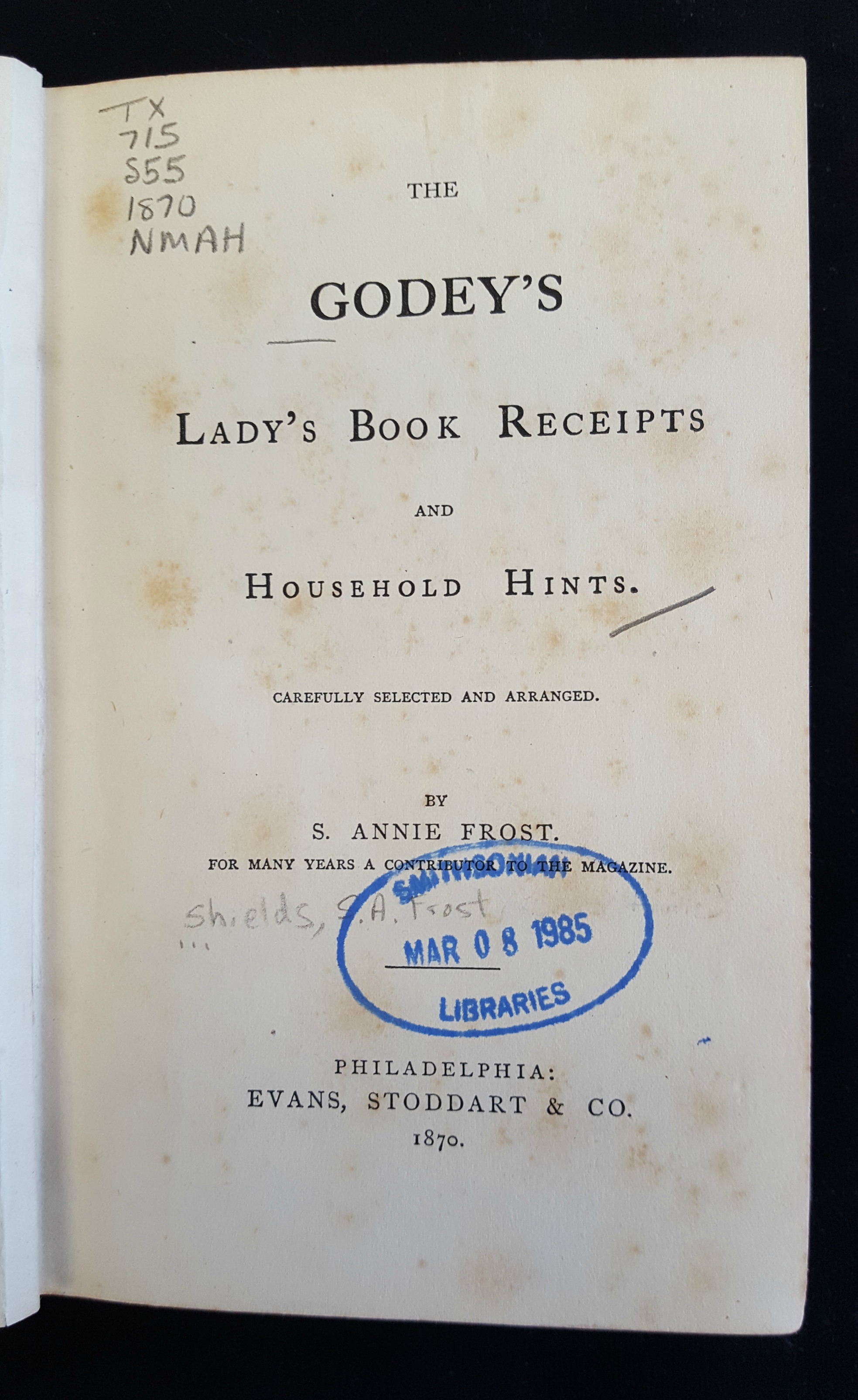 The Godey’s Lady’s Book was a widely read journal that pioneered the field of women’s magazines. When first published in 1830, it included mainly images of the current fashions, but later it expanded to include fiction, essays, and recipes. In 1870, the magazine published its first cookbook, The Godey’s Lady’s Book Receipts and Household Hints. The book is a compilation of featured recipes along with a chapter of household and cooking advice. The chapter ends on a playful note with a poem —each couplet is a cooking tip or proverb. The author, Sarah Annie Frost (later Sarah Annie Frost Fields) was a contributor to the magazine for many years. Books like this are particularly useful to the staff in the Home and Community Life Division at the Smithsonian's National Museum of American History for researching how thoughts on household management and the roles of women have changed over the years.
