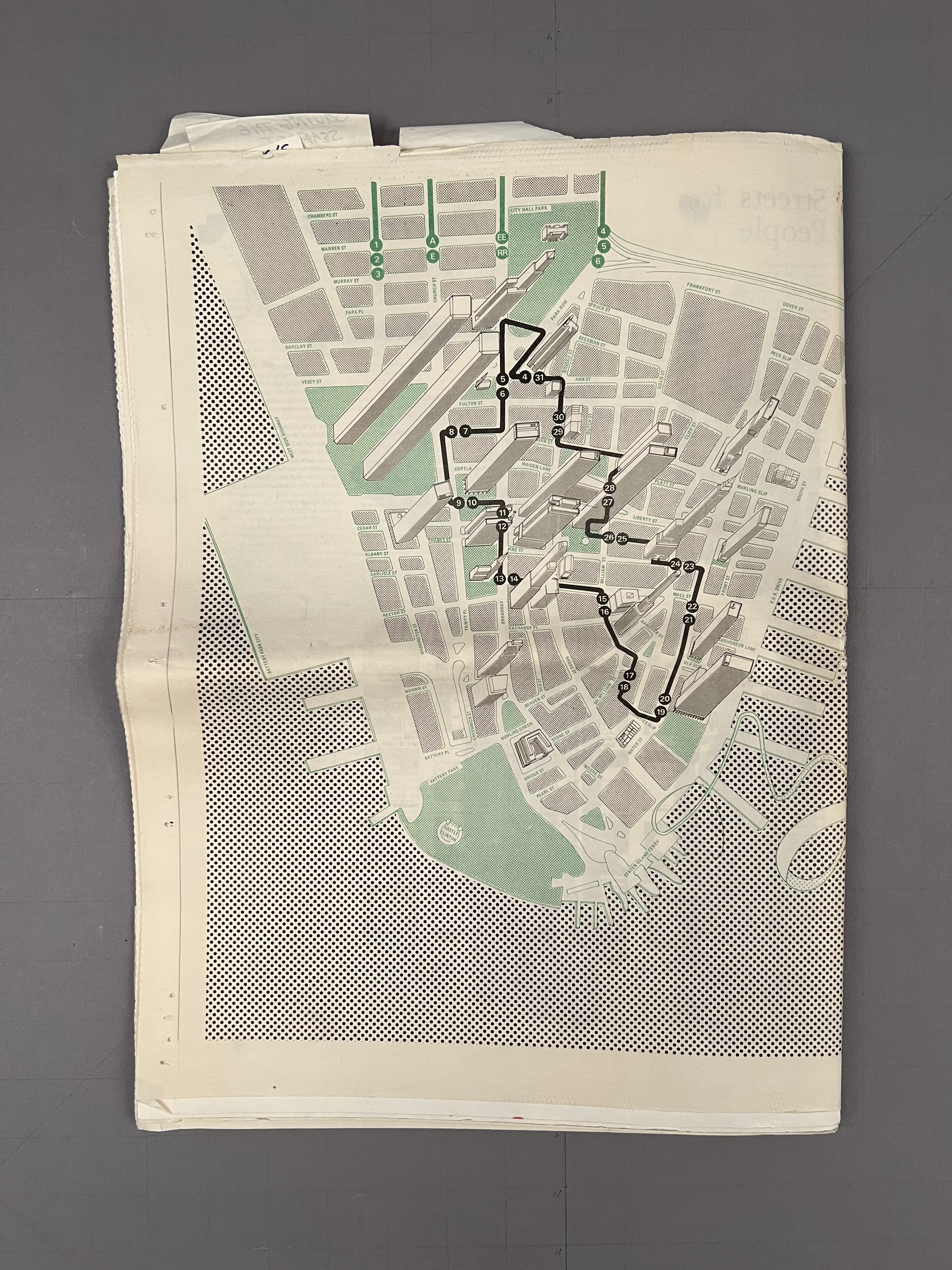Immovable Objects I was the first of a series of Cooper Hewitt, Smithsonian Design Museum exhibitions to showcase architecture and urban design beyond the walls of its home at the Carnegie Mansion on East 91st Street. Project director Dorothy Twining Globus and museum director Lisa Taylor produced the exhibition in the summer of 1975, shortly before the then-named Cooper-Hewitt Museum of Design reopened to the public as the newest of the Smithsonian museums. The exhibition invited viewers on a self-guided walking tour from Battery Park to the Brooklyn Bridge; this booklet not only served as the exhibition catalog, but also as tour guide. In lieu of traditional wayfinding signage, the museum had arranged for businesses in the Exhibition Loop to attach special “ticker tape” to their facades.