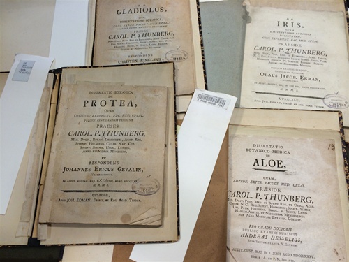 In 18th- and 19th-century Europe, it was standard practice for university professors to write their students' dissertations; the student's job was to explicate and defend the thesis. At the University of Uppsala (Sweden), first Linnaeus and then Thunberg wrote hundreds of these botanical papers, usually focused on taxonomic and systematic matters — either describing and naming genera and species or analyzing basic issues of classification. The Cullman Library holds dozens of these small, individually published papers, many of them housed in old acidic pamphlet-binders. This particular example is focused on the castor oil plant (ricin).