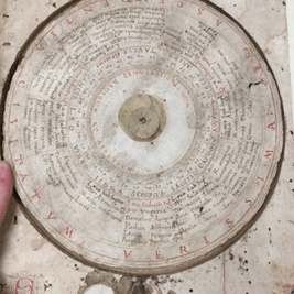 The word Volvelle comes from the Latin verb volvere, which means to turn. For more than 800 years, designers and paper engineers have included volvelles within books to educate and entertain readers. The moving parts of a volvelle can often be the best way to illustrate complicated subjects, from the vast expansion of the planets to the compact arrangement of organs in the human body. [To see more volvelles, take a look at Cosmographicus, found in the Smithsonian Libraries.]